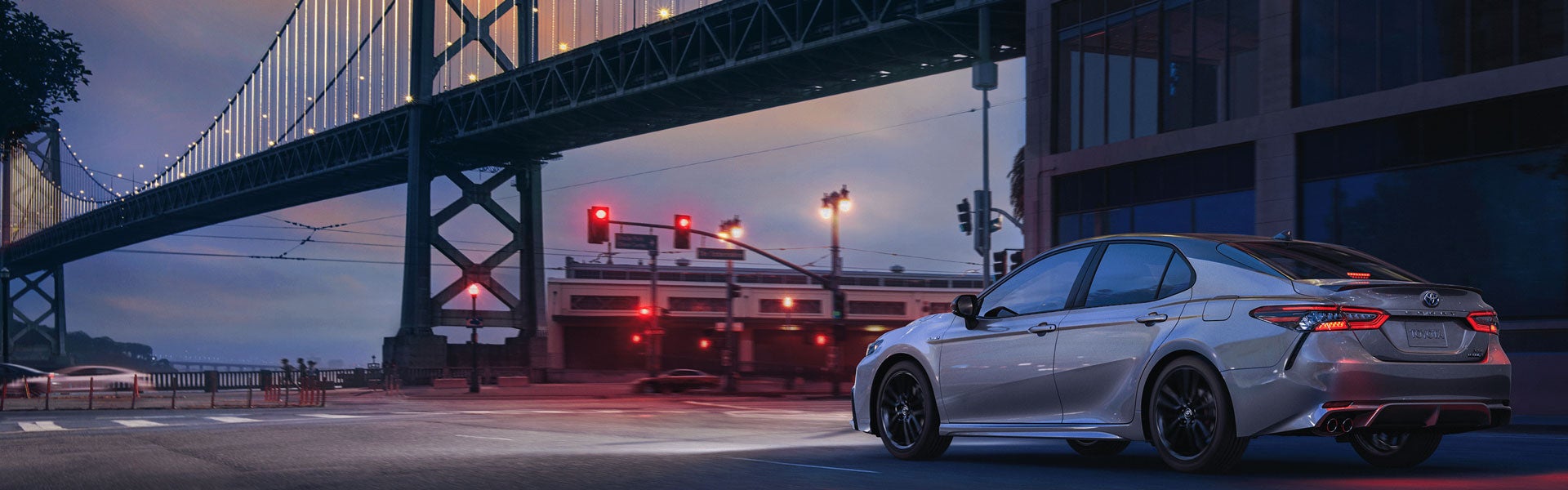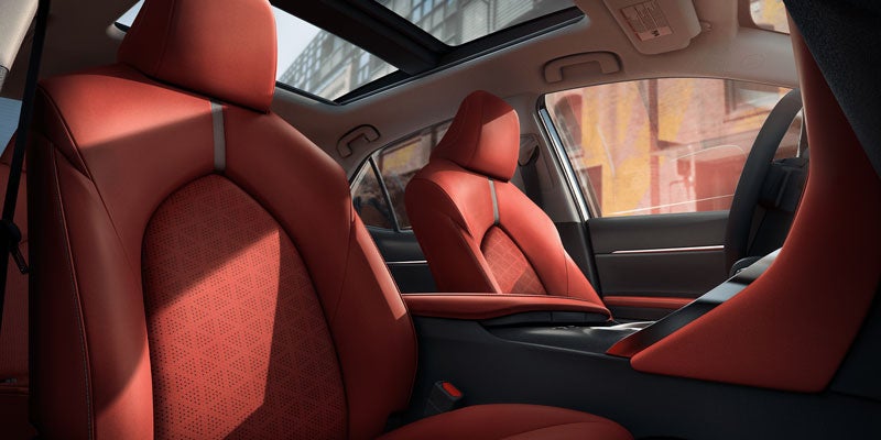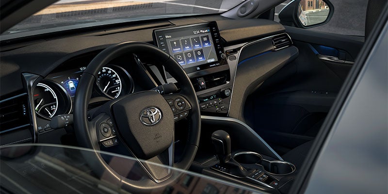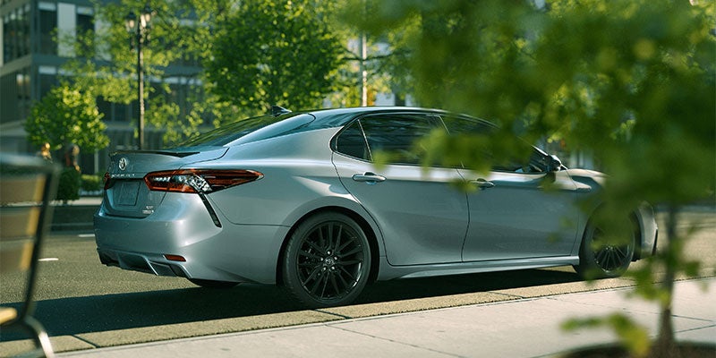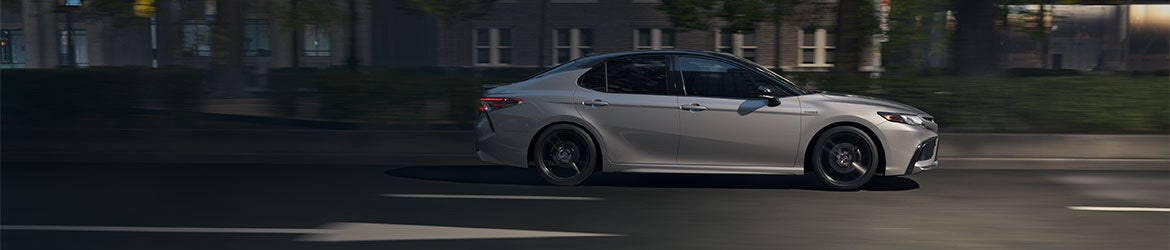 Camry Hybrid's powerful shape and captivating design will announce your arrival with authority. Sweeping curves and chiseled surfaces complement its muscular build, leaving us with a unique silhouette that redefines the look of efficiency. Standard on XSE, new 19-in. gloss-black wheels will turn heads wherever you’re headed. Camry Hybrid’s available LED headlights add a distinctive look to its unmistakable style.