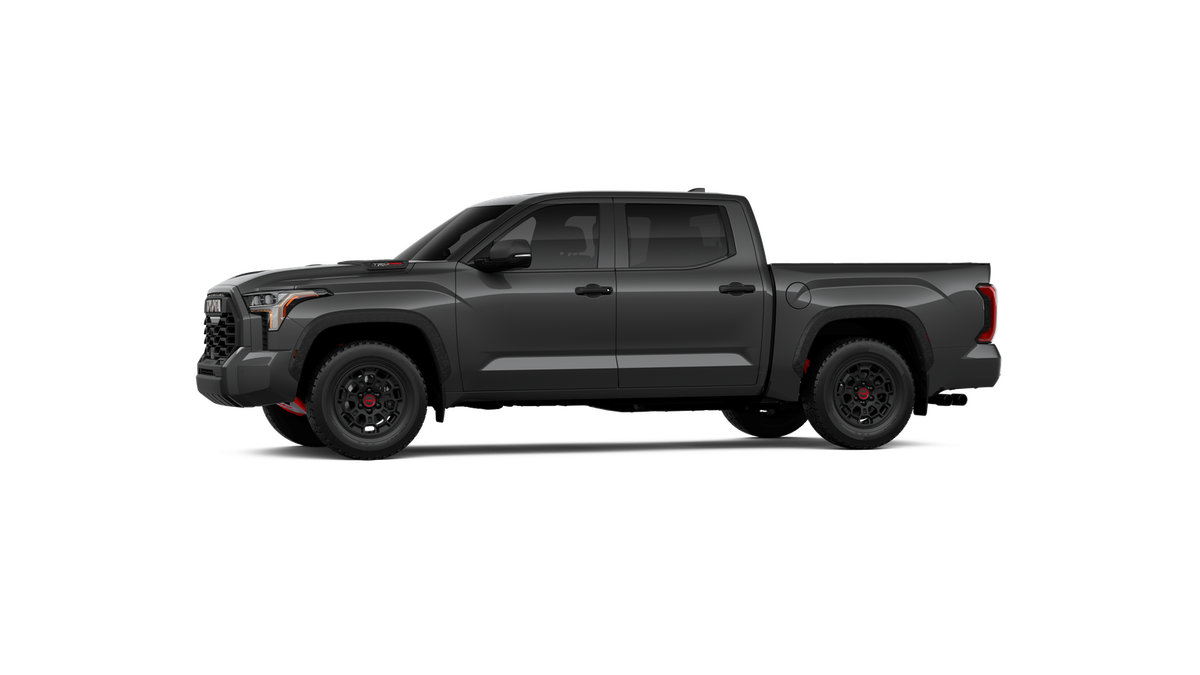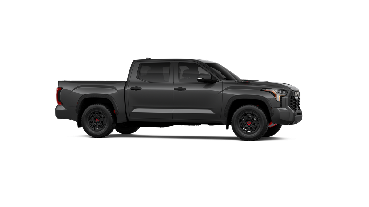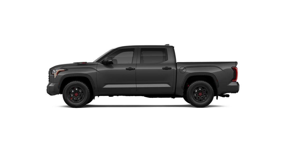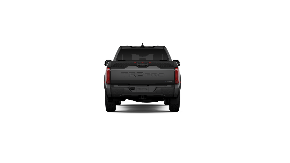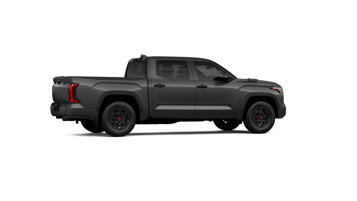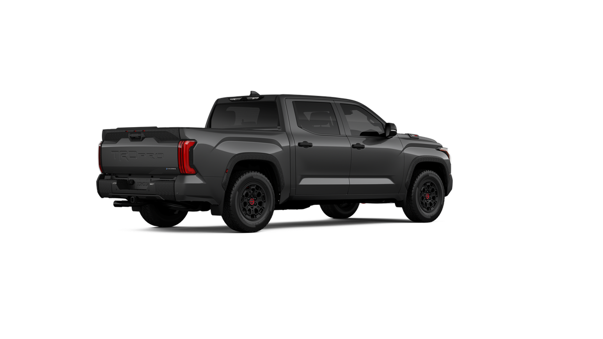 - "TRD PRO" hood badge; black door handles; black window molding and mirror caps; black technical-camo-grained tailgate spoiler and overfenders with marker lights
